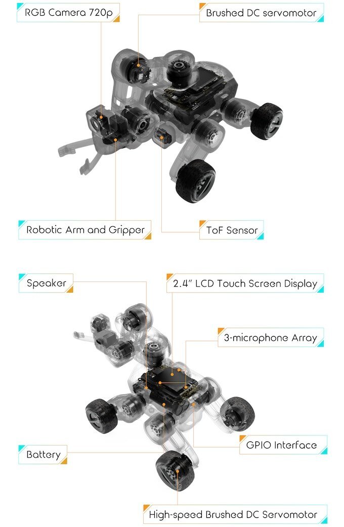 다양한 로봇 기능에 대한 라이브러리와 ChatGPT를 이용한 작업 및 AI를 이용한 맞춤형 트레이닝이 가능합니다. 마이크가 3개 여서 모든 각도에서 음성을 인식할 수 있으며, 그래픽이나 파이썬을 이용한 프로그래밍도 가능합니다.