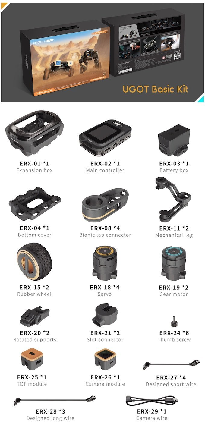 유갓(UGOT)은 기본 키트와 풀 키트로 구성되어 있으며, 크라우드 펀딩시 선택이 가능합니다. 주요 모듈은 다음과 같이 구성되어 있습니다.