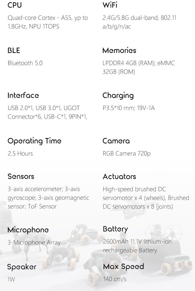 자기 인코더 액추에이터 같은 혁신적인 기능으로 정확하고 빠른 움직임이 가능하며 센서 모듈과 독립적인 NPU는 확장된 AI 시나리오 및 오프라인 기능으로도 제어가 가능합니다. 음성 인식 및 다중 장치 연결 기능도 사용자에게 로봇 제어가 어렵지 않고 재미있다는 경험을 제공합니다.