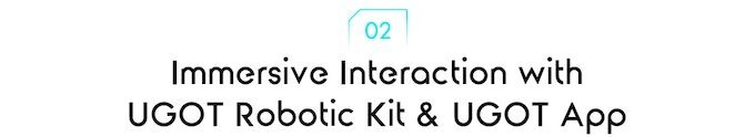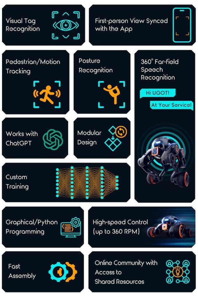 유갓(UGOT)은 시각적인 태그 인식, 앱과 동기화된 FPV, 보행자 및 모션 추적, 자세 인식, 음성인식 같은 다양한 제어와 기능이 가능하며, 모듈화 되어 빠른 조립이 가능합니다.