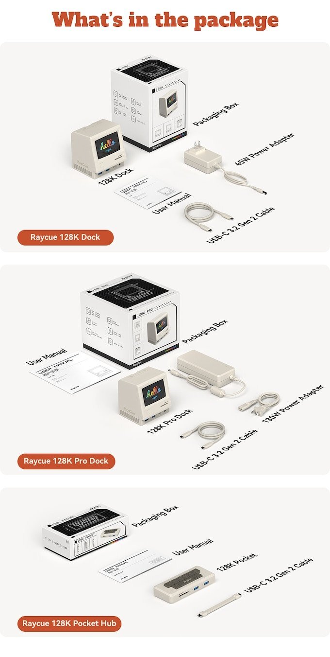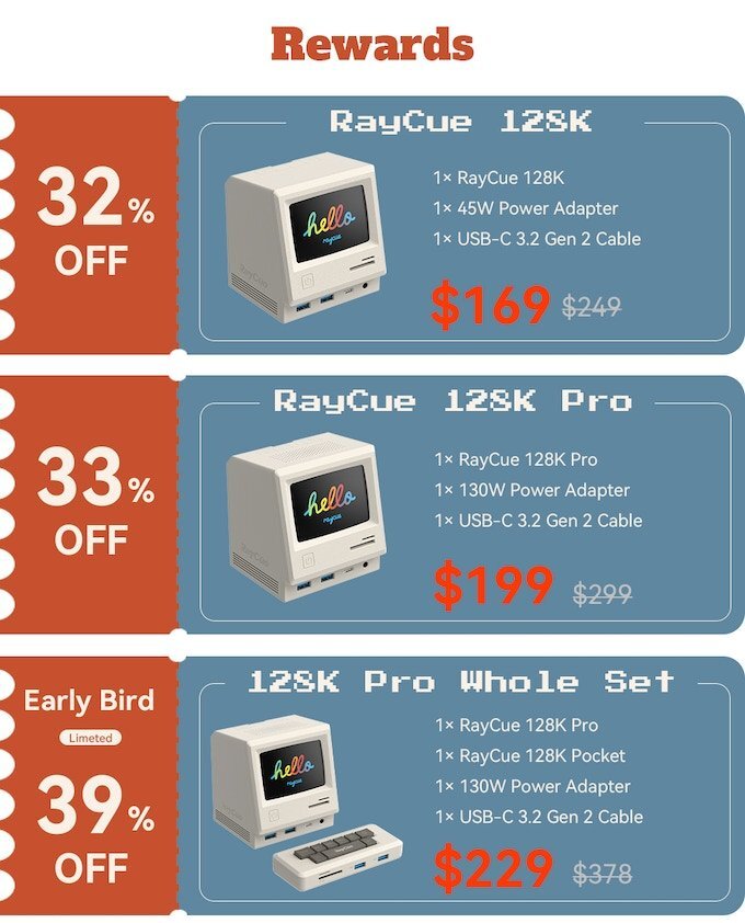 레이큐(RayCue)는 컴퓨터 인터페이스의 혁신을 위한 스타트업으로 매킨토시 128K의 디자인을 기반으로 도킹 스테이션을 제작하였습니다. 레이큐 128K는 재미와 기능성 적절한 향수를 결합하여 매킨토시 128K의 미니어처 처럼 보이나 다재다능한 도킹 스테이션 입니다. 블루투스 스피커, 디지털 포토프레임 뿐 아니라 외부 디스플레이를 연결을 지원하기도 합니다.