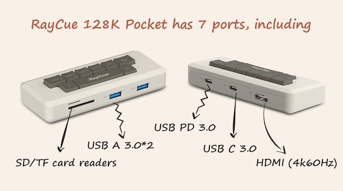 레이큐 128K는 세가지로 구성되어 있습니다. 레이큐 128K, 레이큐 128K Pro, 포켓 허브 입니다. 기본적으로 도킹 스테이션(Docking Station)으로 분류 되며, USB 허브, SD카드 리더기, 충전단자, 디스플레이 출력 단자를 제공합니다.