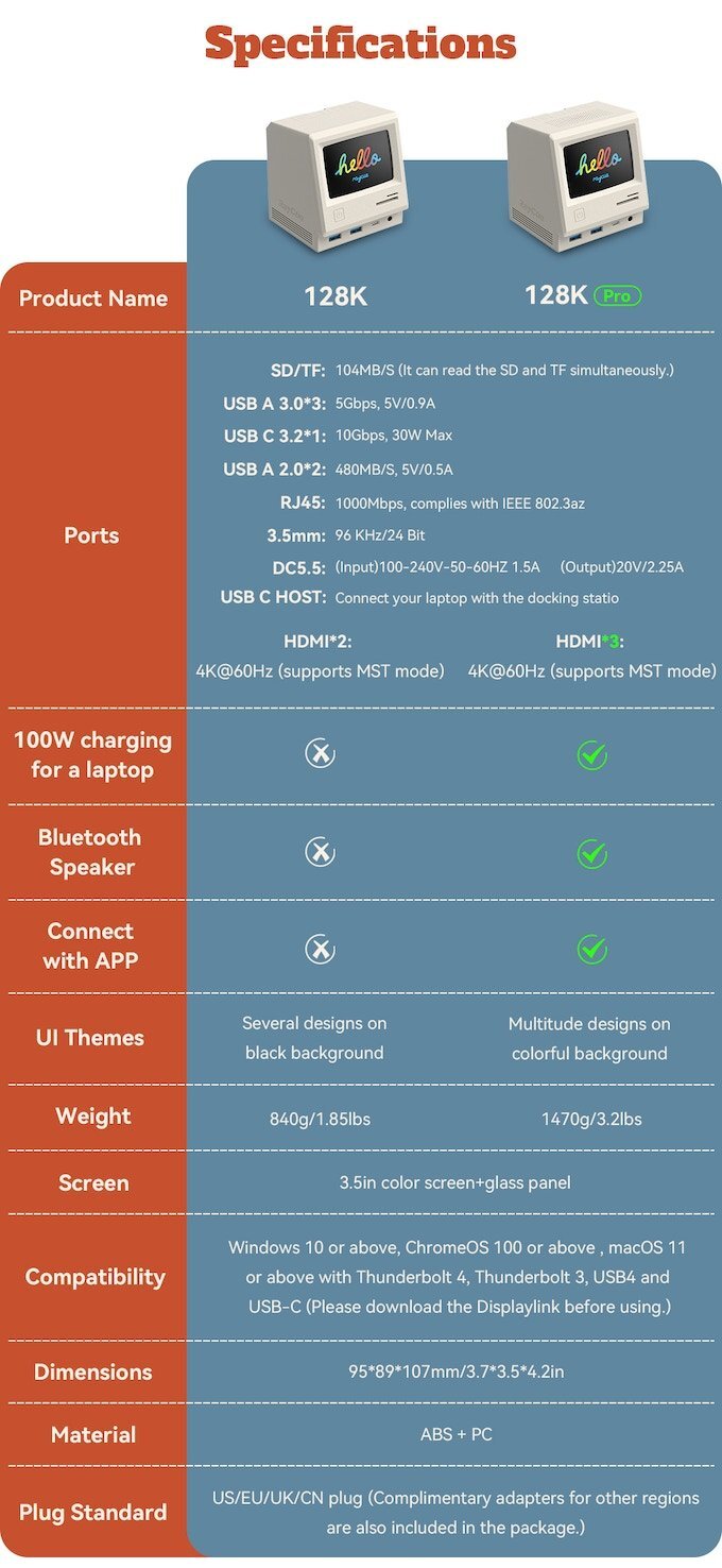 레이큐 128K Pro는 HDMI 단자가 3개로 멀티 모니터 사용이 가능합니다. 레이큐 128K Pro만의 기능으로 100W 이상의 충전기를 연결시에 노트북에 전원 연결이 가능하며, 블루투스 스피커, 앱을 통한 스마트폰과 연결되는 기능이 추가되어 있습니다. 이러한 세가지 기능만 없는 레이큐 128K에는 HDMI 단자가 2개를 이용한 멀티모니터가 가능합니다.
