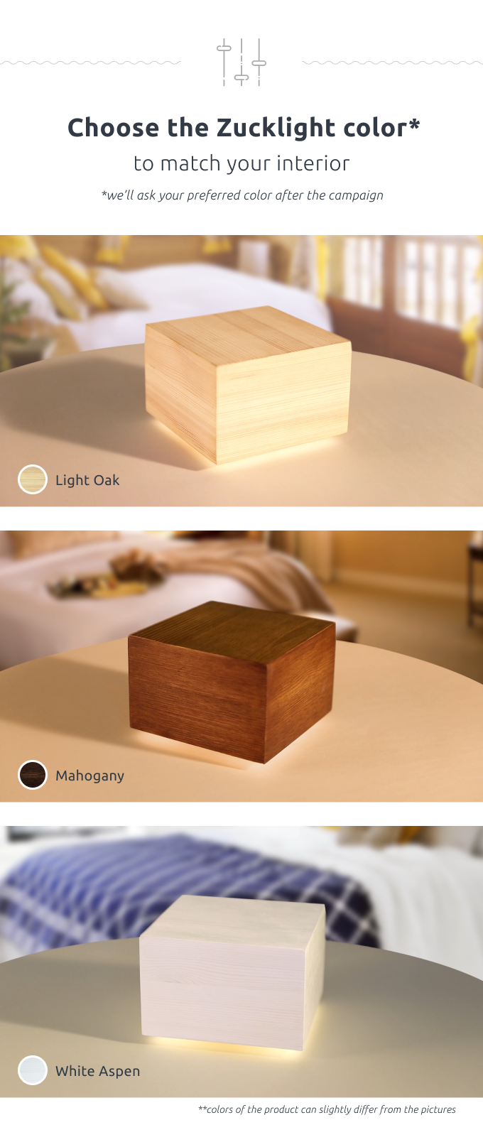 주크라이트(Zucklight)는 밝은 참나무, 어두운 마호가니, 흰색 미루나무를 소재로 하여 사용하시는 가구와 어울리도록 3가지 색상중에 하나를 선택할 수 있습니다. 킥스타터 크라우드 펀딩이 끝난 후에 제조사에서 원하는 색상을 선택할 수 있도록 이메일을 보내올 것입니다.