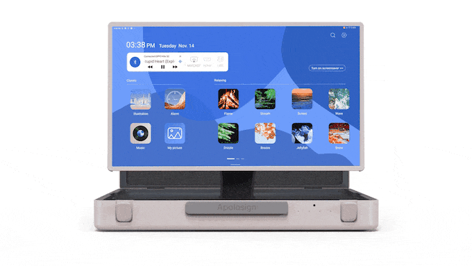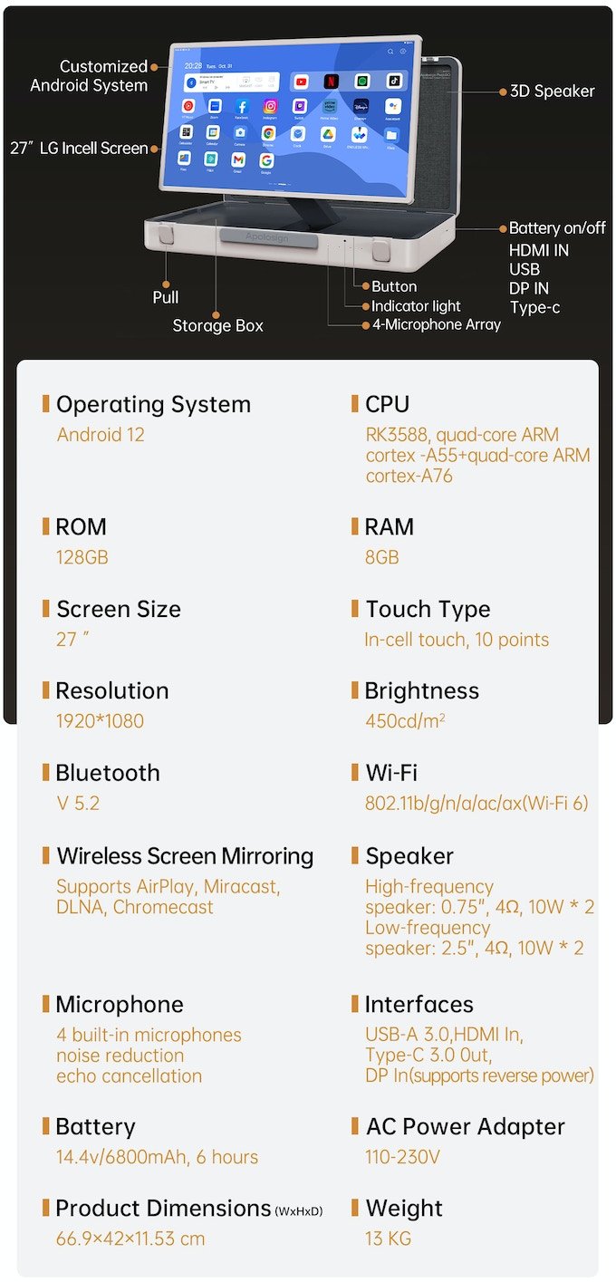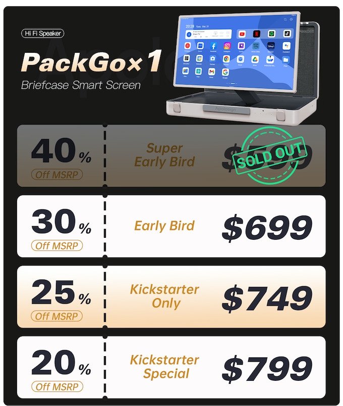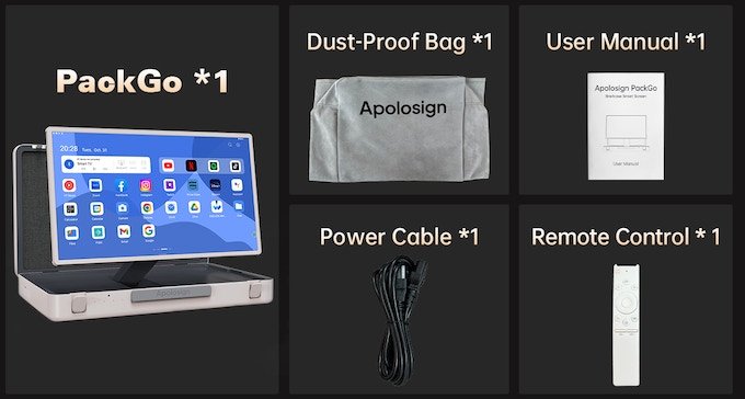 아폴로사인(Apolosign)은 중국 심천(Shenchen)의 터치 디스플레이 모니터와 TV를 만드는 업체입니다. 스탠바이미 고와 거의 일치하는 디자인의 팩고(Pack Go)는 상대적으로 저렴한 가격에 킥스타터(Kickstarter)에서 크라우드 펀딩을 진행하고 있습니다. 차이점으로 내장 배터리는 6시간 정도 사용할 수 있도록 6800mAh의 충전지를 내장하고 있습니다.