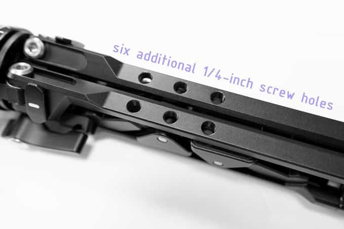 삼각대에는 추가 조명, 스마트폰 또는 기타 장치를 부착하기 위한 6개의 추가 1/4인치 나사 구멍도 있습니다.