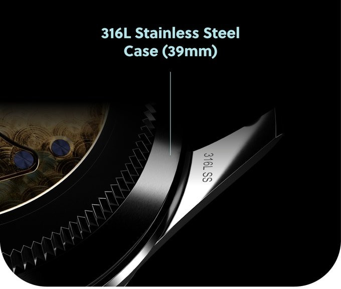 내구성이 뛰어나고 부식에 강한 316L 스테인리스 스틸 케이스로 세련되고 현대적인 외관을 제공합니다.