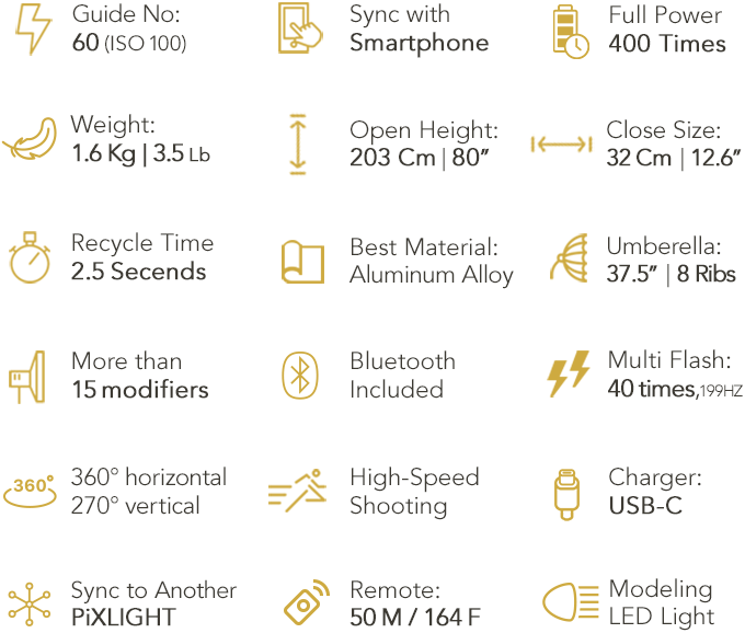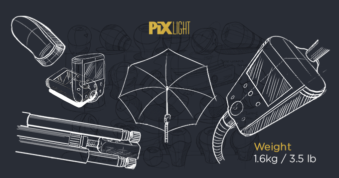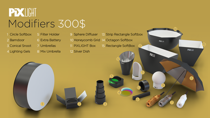 픽스라이트(PiXLIGHT)의 기본 세트는 삼각대 플래시 본체와 조명용 우산이며, 이외에도 아래와 같은 다른 조명 액세서리를 추가 할 수 있습니다.