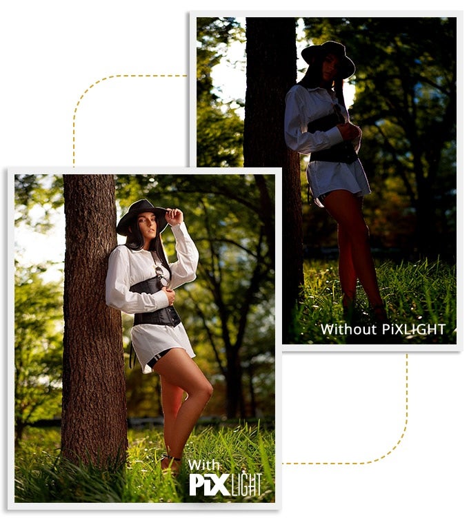 픽스라이트(PiXLIGHT)은 메인 광으로 사용하기 좋은 조명장치입니다. 접이식 삼각대 형태로 자연스러운 빛을 만들어 줍니다.