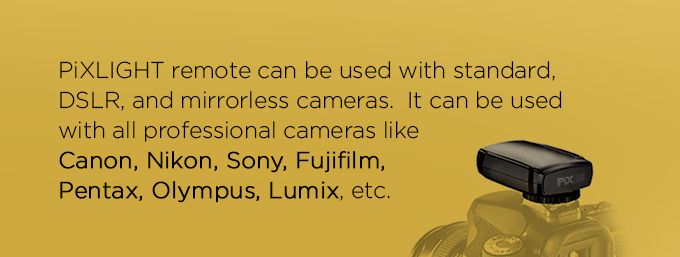 픽스라이트(PiXLIGHT)는 리모콘을 통해 DSLR과 미러리스 카메라에 사용 가능합니다. 캐논, 니콘, 소니, 후지, 펜탁스, 올림푸스, 파나소닉 루믹스 등의 카메라 슈에 장착하여 촬영시에 연결됩니다.