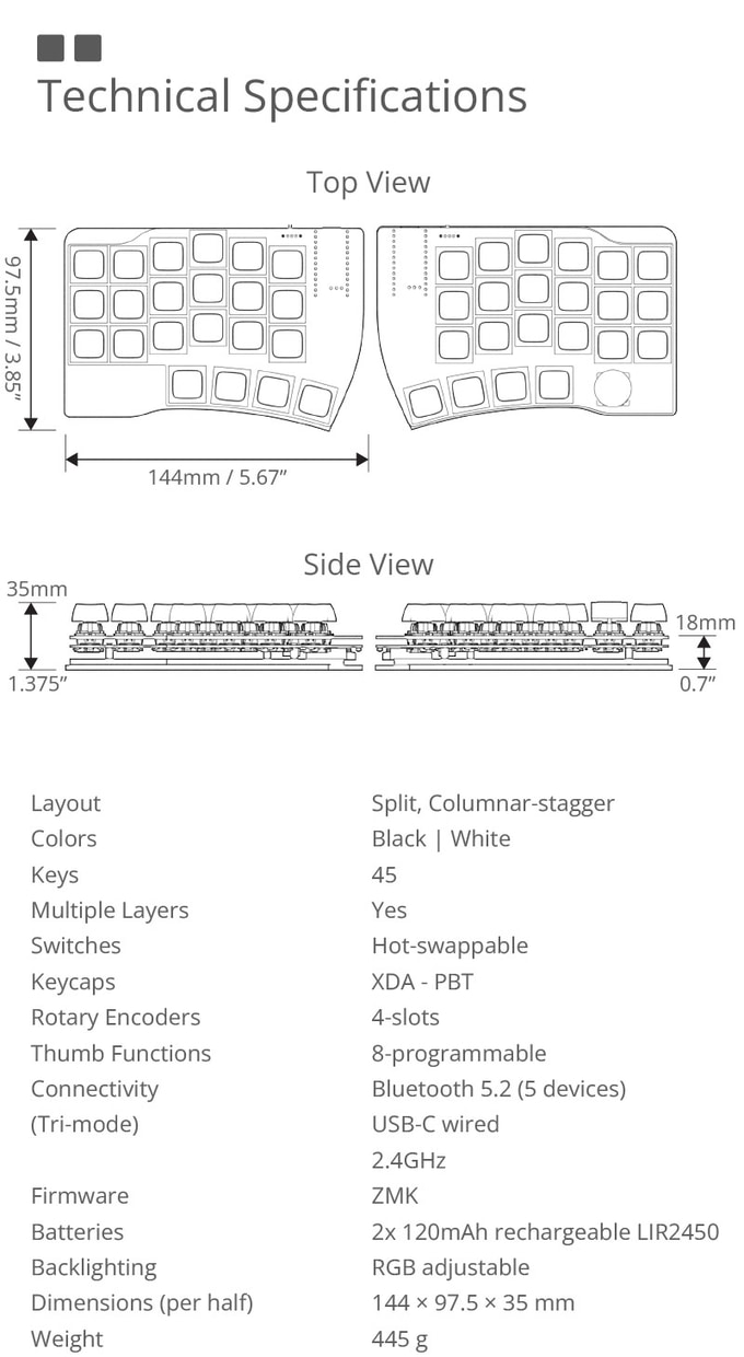 윙45(Wing45)는 스플릿, 컬럼 스태거 레이아웃, 텐팅 패드라는 세 가지 디자인 요소로 편안함을 최적화하고 손목의 피로감을 최소화합니다.
