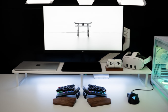 미니멀한 디자인은 스위치와 언더글로우를 강조하며, 현대적 감각과 깔끔한 라인의 조화를 이룹니다. 책상 분위기에 맞춰 내추럴 또는 블랙 색상을 선택하여 세련된 데스크 환경을 완성할 수 있습니다.