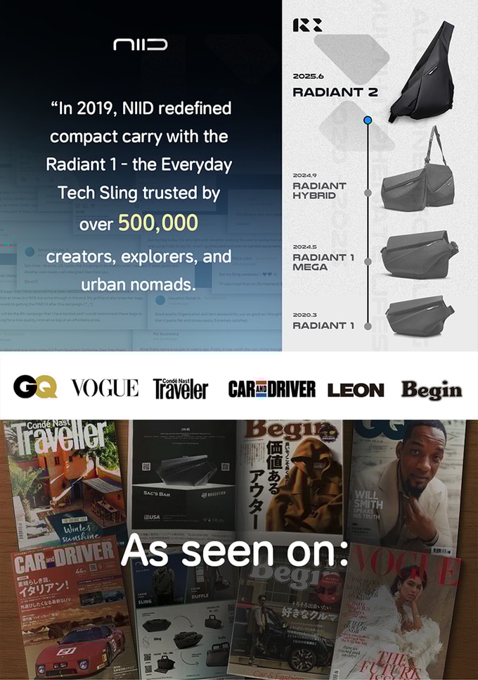 · Radiant II 번들(Slingbag + Tech Sling): $99 (한국배송료 +$12) / 총 $111 (약 15만4천원)