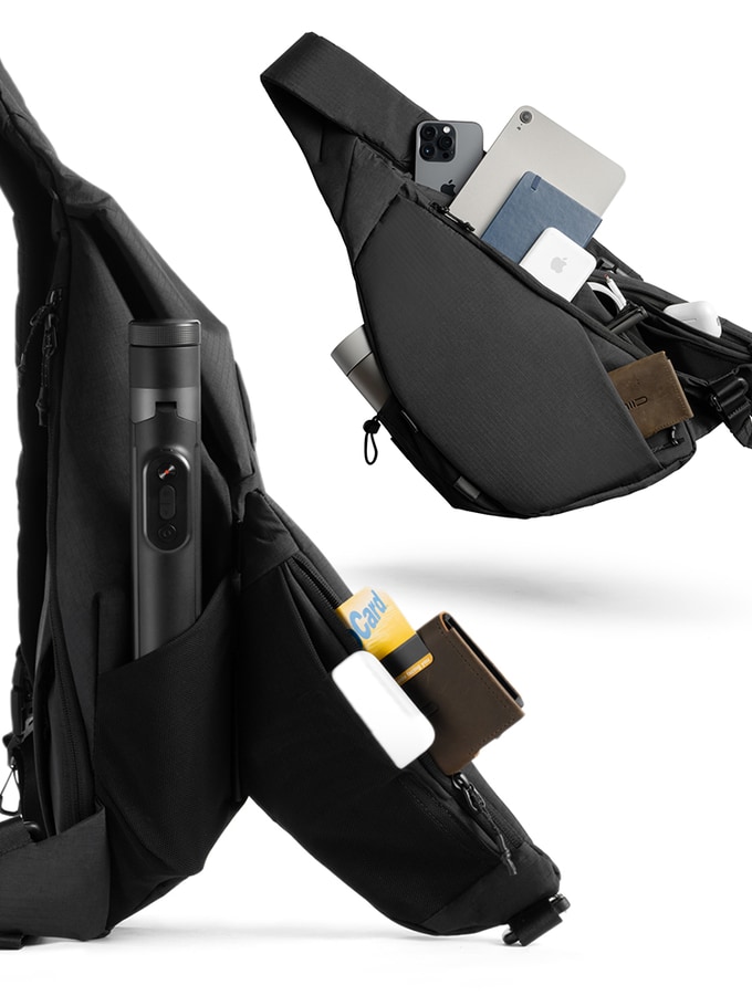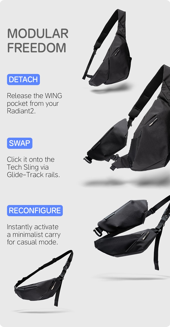 래디언트2(Radiant II)는 윙포켓(WING Pocket)과 테크 슬링(Tech Sling) 두 모듈을 15초 만에 결합하여, 가볍고 컴팩트한 데일리 슬링으로 변신합니다. 이는 도심 탐험에 최적화된 휴대성을 제공합니다.
