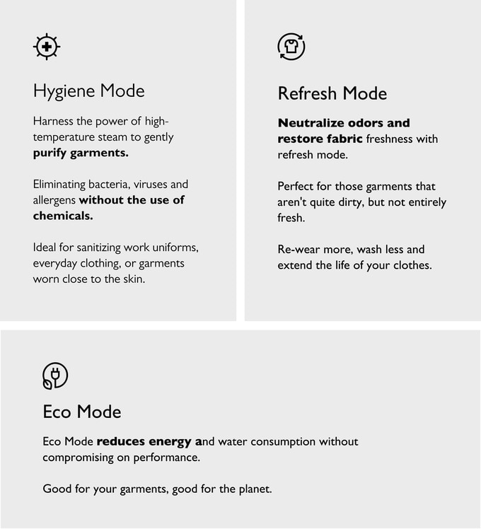 고온 스팀의 힘을 활용하여 의류를 부드럽게 정화합니다.화학 물질을 사용하지 않고 박테리아, 바이러스 및 알레르겐을 제거합니다.작업복, 일상복 또는 피부에 가까이 착용하는 의류를 살균하는 데 이상적입니다.
