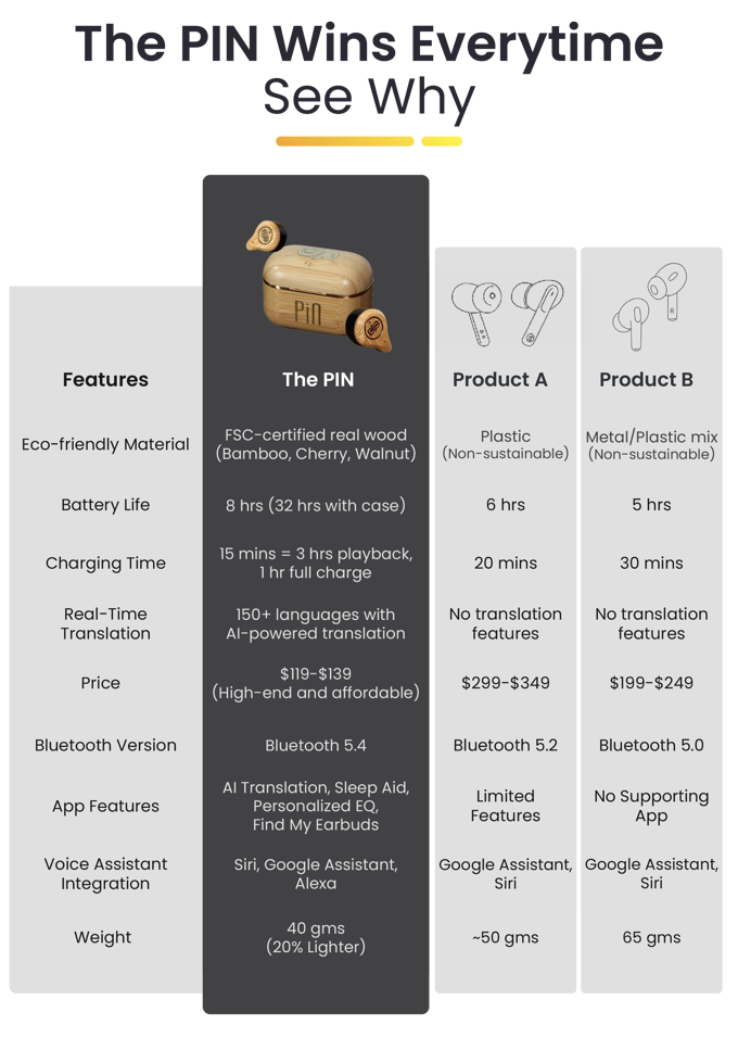 더 핀(The PIN)은 실제 세가지 나무를 이용하여 디자인된 친환경 AI 이어버드 입니다. 내장된 AI 통번역 기능으로 150개 이상의 언어를 실시간으로 지원합니다. 또한 주변 소음을 제거하여 최상의 오디오 품질로 통화가 가능하며, 언어의 장벽을 넘어선 소통까지 첨단 기술을 제공합니다. AAC 오디오 코덱을 사용하여 고품질 사운드를 지원하는 이어버드의 기본에도 충실합니다.