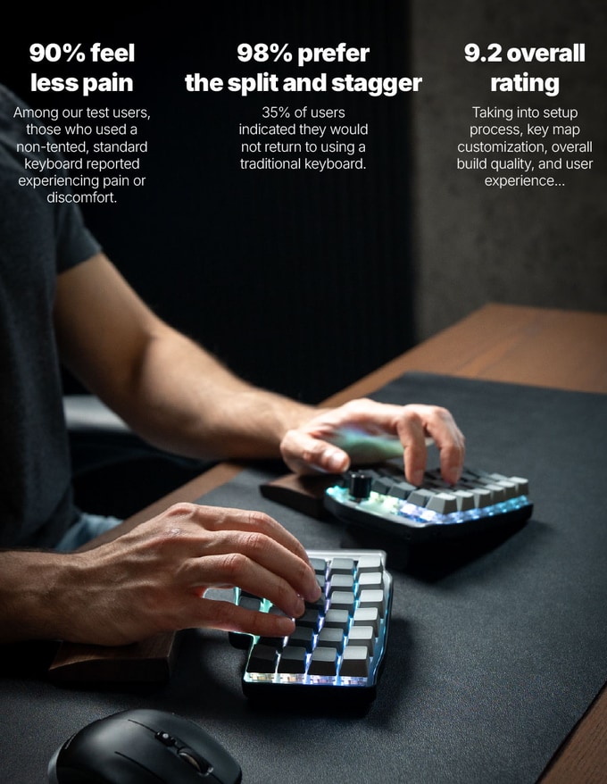 기존의 평평한 키보드와 달리, 분리형, 스태거, 곡선형 디자인은 건강한 타이핑 각도를 유지시켜 반복 긴장성 손상 증후군(RSI)을 예방합니다. 더 빠르고 직관적인 자이트(Zythe)로 생산성을 최대 20%까지 향상시킬 수 있습니다.