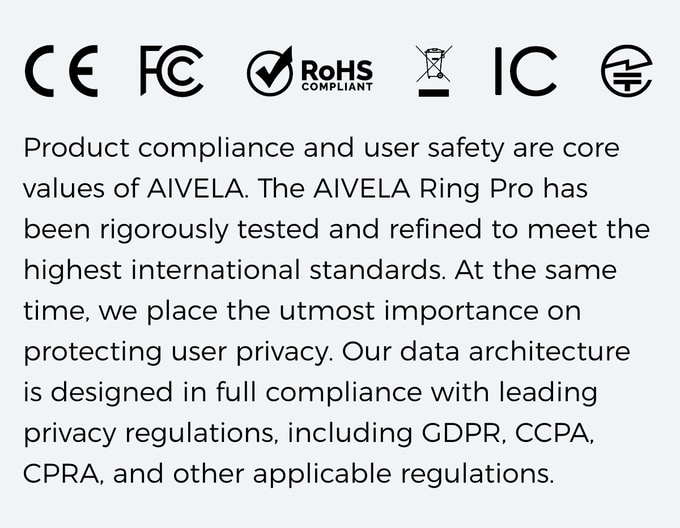 아이벨라 링 프로(AIVELA Ring Pro)는 국제 표준을 충족하도록 설계되었으며, 엄격한 테스트를 거쳐 안전성을 확보했습니다. 또한 GDPR 등 주요 개인정보 보호 규정을 완벽히 준수하는 데이터 아키텍처를 통해 사용자의 개인정보를 철저히 보호합니다.