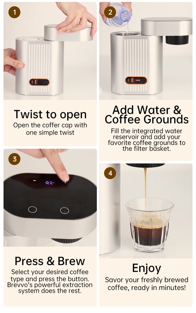휴대용 커피머신의 장점과 일반적인 에스프레소 머신의 장점을 모두 살려 제작된 브레보(Brevvo)는 어디서나 바리스타 급의 커피를 마실 수 있습니다.
