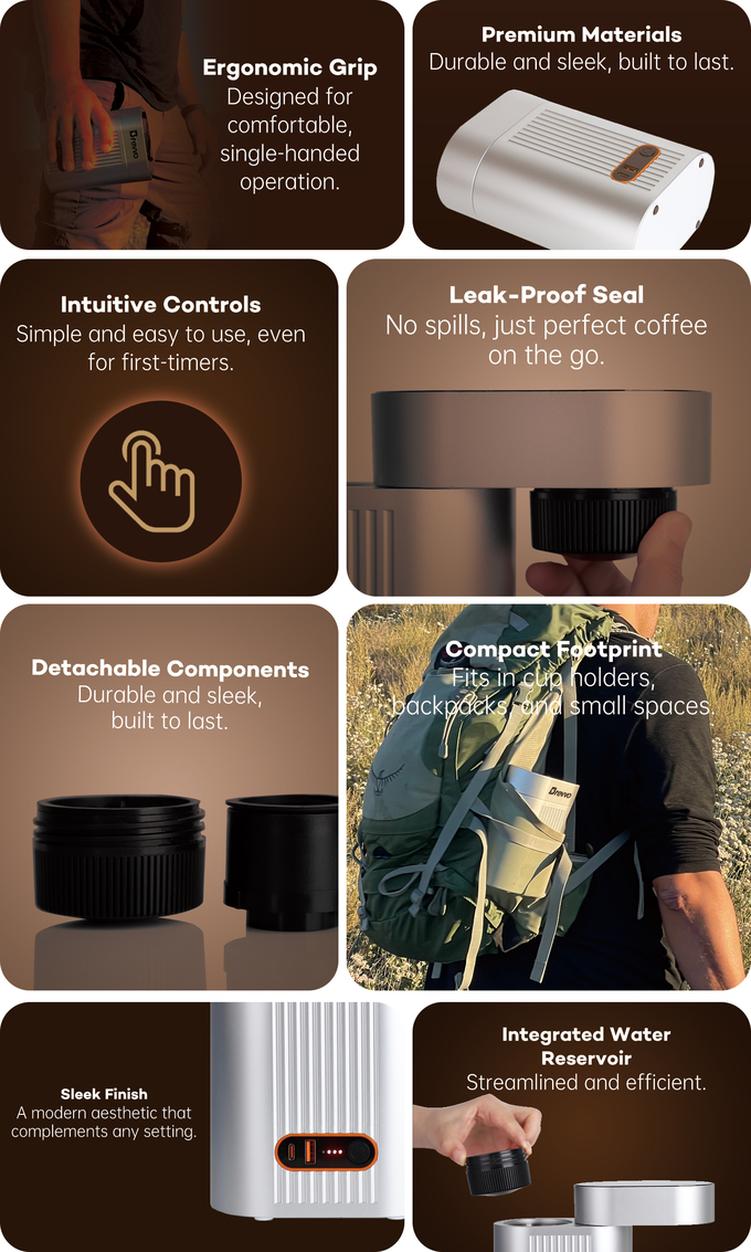 캠핑, 로드 트립, 하이킹 등 브레보(Brevvo)의 장시간 지속되는 배터리와 충격, 흠집에 강한 견고한 설계로 야외 활동에 최적화되었습니다. 가볍고 휴대하기 편하여 커피 한잔이 필요할 때 완벽한 동반자가 됩니다.