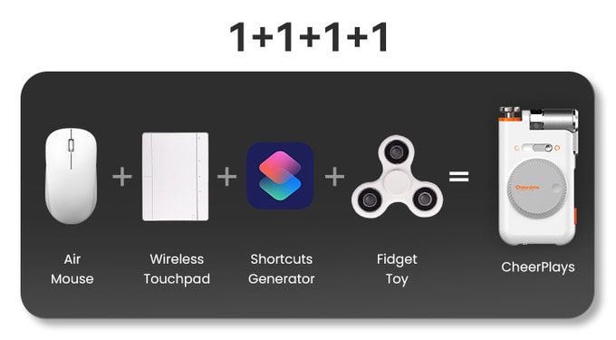 치어플레이(CheerPlay)는 피젯 토이 모양으로 제작된 올인원 터치패드 입니다. 에어 마우스, 터치패드, 프레젠테이션 리모컨, 10m 무선 카메라 셔터 기능을 하나로 결합했습니다. 최대 30일 지속되는 배터리와 10m 블루투스 범위로 노트북, 태블릿, 스마트폰 등 다양한 기기를 완벽하게 제어합니다. 긴장되는 순간에는 피젯 기능으로 집중력 향상과 스트레스 해소를 돕는 올인원 컨트롤러 입니다.