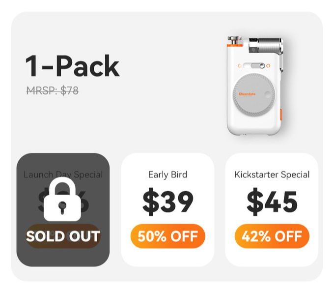 CheerPlay는 다음과 같은 일정으로 해외의 킥스타터 (Kickstarter) 크라우드 펀딩을 진행 중입니다. 후원(Pledge)의 보상으로 제품을 배송 받을 수 있습니다.