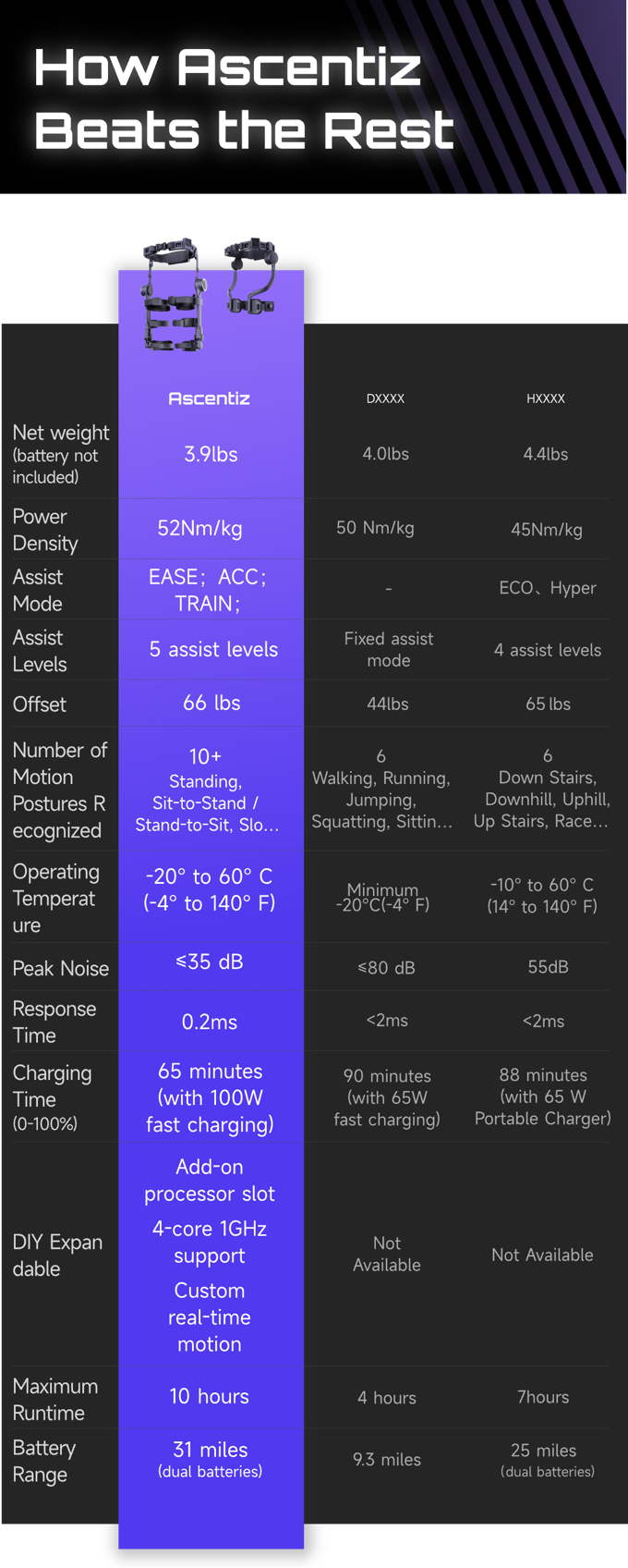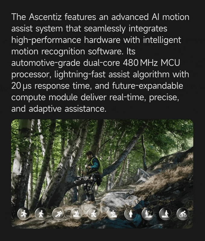 어센티즈(Ascentiz)는 '모든 지형을 위해 설계된' 모듈형 외골격으로, 하이킹, 등반, 사냥 등 극한의 아웃도어 활동부터 통근, 자전거, 사진 촬영과 같은 일상 및 레저 활동까지 폭넓은 환경에서 사용자에게 강력한 보조력과 지구력을 제공합니다.