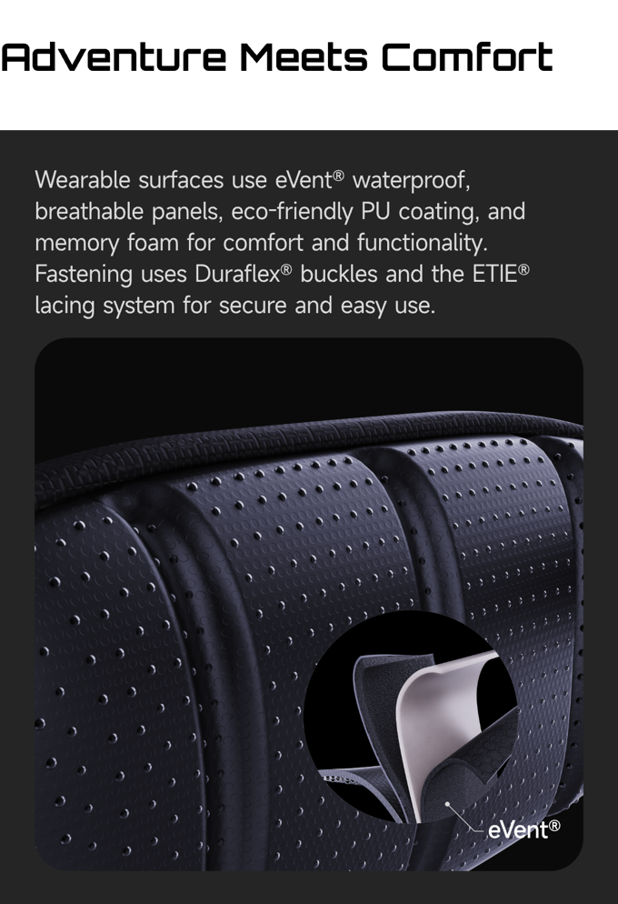 어센티즈(Ascentiz)는 eVent® 방수 및 통기성 패널, 친환경 PU 코팅, 그리고 메모리 폼을 사용하여 뛰어난 착용감을 제공합니다. 또한 Duraflex® 버클과 ETIE® 레이싱 시스템을 통해 안전하고 간편한 착용 및 사용이 가능하도록 설계되었습니다.