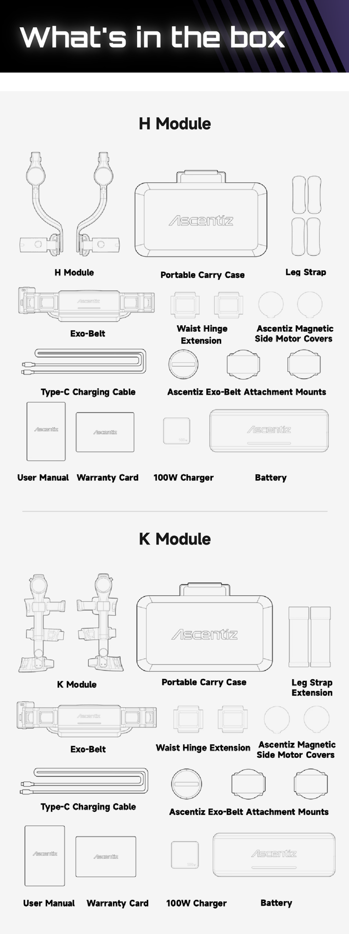 어센티즈(Ascentiz)의 구성품은 힙 모듈(H module), 무릎 모듈(K module)에 따라 구분되어 구성되어 있습니다. 두가지 H와 K 모듈을 함께 사용할 수도 있습니다.