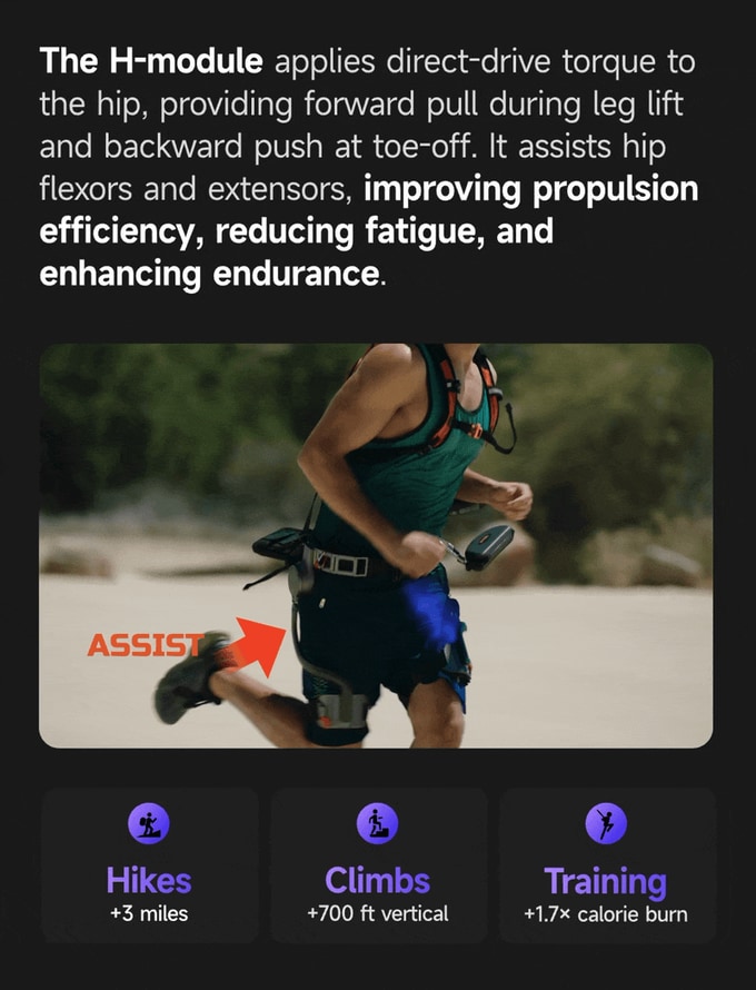 H 모듈은 힙에 직접 토크를 전달하여 다리 올림 시 전방 견인과 발가락 떨어짐 시 후방 추진력을 제공합니다. 이를 통해 추진 효율을 개선하고, 피로를 줄여 하이킹 거리와 수직 상승 고도를 늘리며 훈련 효과를 극대화합니다.