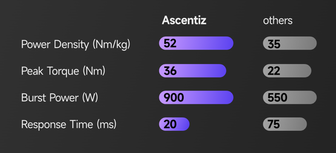 어센티즈(Ascentiz)는 휴머노이드 로봇 기반의 첨단 FOC 알고리즘과 52 Nm/kg 출력 밀도를 갖춘 준직접 구동 모터를 통해 900 W의 폭발적인 토크(36 Nm)를 즉각적으로 구현합니다. 이를 통해 20ms 내에 최대 파워에 도달, 사용자의 움직임에 완벽히 통합된 초인적인 동력을 제공합니다.