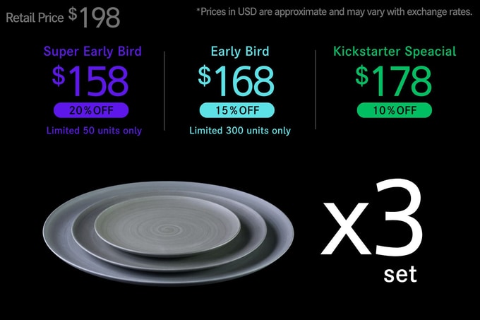야마추 아리타(Yamachu Arita) 접시는 5.9, 7.9, 9.8인치 (15, 20, 25cm)의 3가지 사이즈로 구성되어 사이드 메뉴부터 메인 요리까지 활용 가능합니다. 6가지 무광 색상 중 선택 가능하며, 크라우드 펀딩 종료 후 설문조사를 통해 색상과 사이즈를 결정할 수 있습니다.