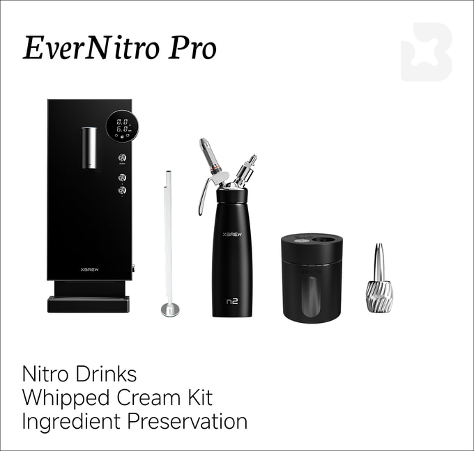 에버나이트로(EverNitro)는 콜드 브루를 넘어 거의 모든 음료에 카페 수준의 나이트로 효과를 선사합니다. 질소를 주입하면 콜드 브루는 부드러운 목 넘김을, 말차는 깊고 풍부한 맛을 얻습니다.