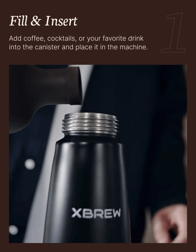 에버나이트로(EverNitro)로 질소 음료를 만드는 과정은 다음과 같습니다. 커피, 칵테일, 좋아하는 음료를 장치에 포함된 캐니스터(Canister)에 넣습니다.