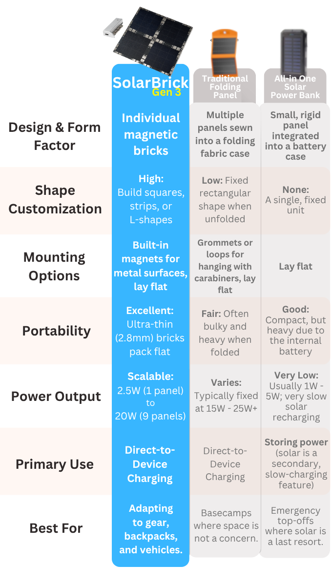 솔라브릭(SolarBrick) Gen 3는 기존 제품과 달리 개별 마그네틱 브릭 형태로 모양을 자유롭게 조절할 수 있습니다. 마그네틱 브릭 수에 따라 출력을 2.5 ~ 20W으로 조절하며, 얇고 휴대성이 뛰어나 기어, 백팩 등에 쉽게 장착해 장치에 직접 충전할 수 있는 최적의 솔루션입니다.