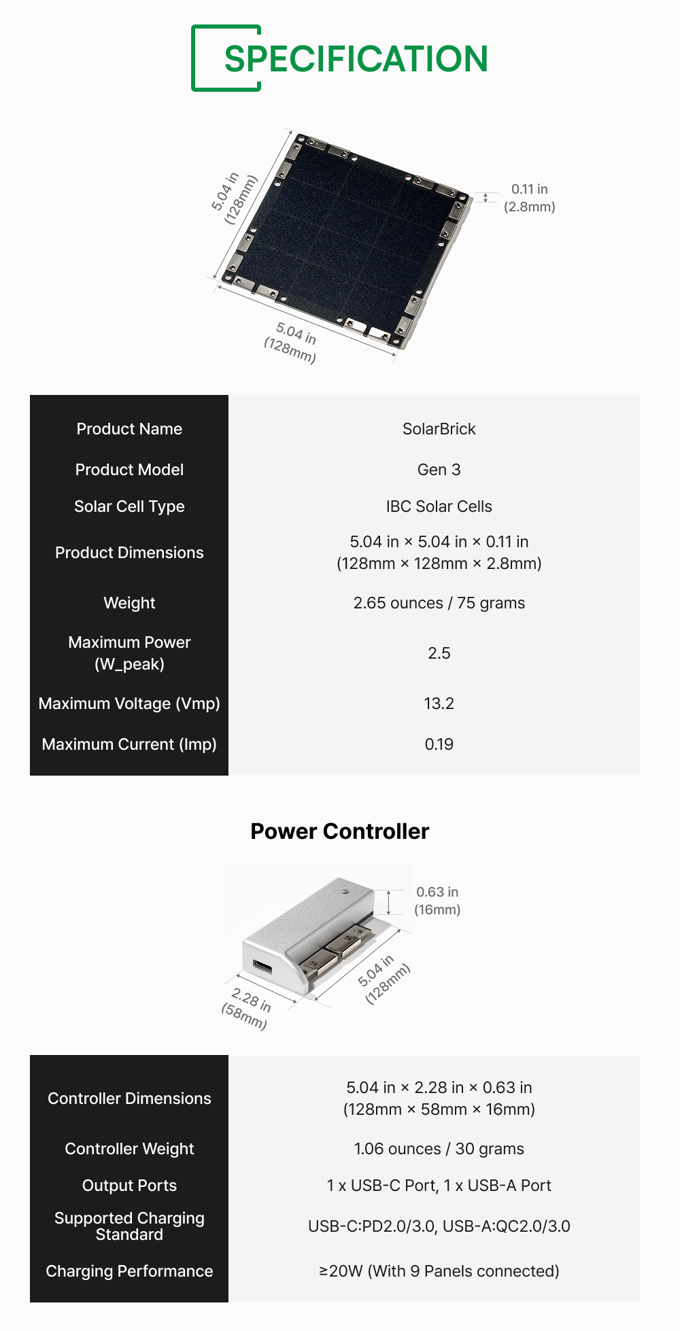 솔라브릭(SolarBrick) Gen3의 모듈형 태양광 패널과 컨트롤러(Controller)의 기술적인 사양은 다음과 같습니다.