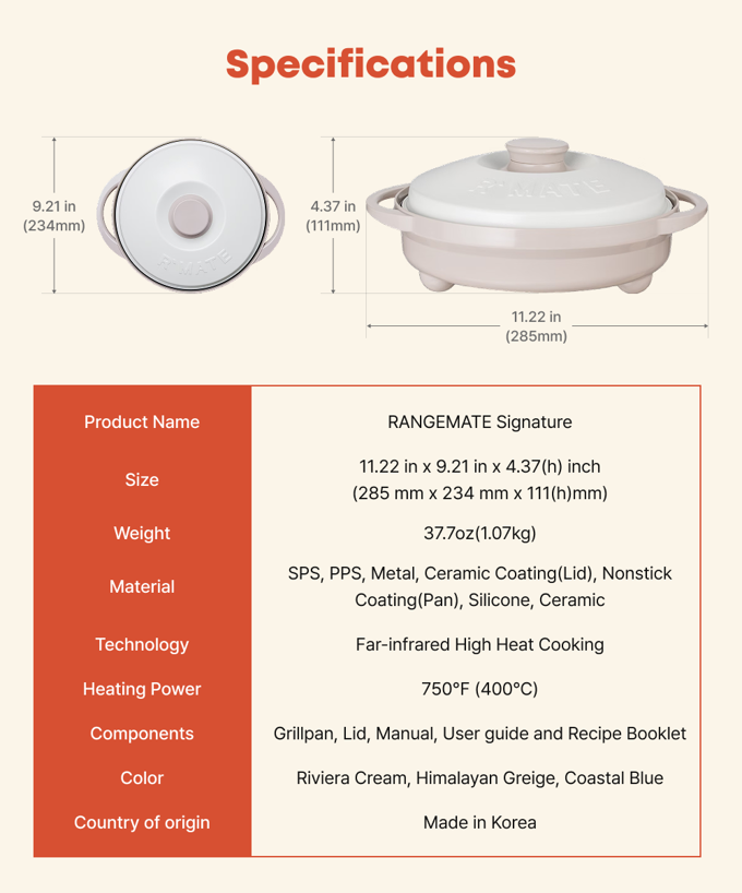 렌지메이트(RANGEMATE) 시그니처는 최대 400℃의 원적외선 열을 활용하여 오븐 수준의 요리를 구현하며, 냉동 식품도 즉시 조리 가능합니다. 연기, 냄새, 기름 튐을 최소화하고, 세라믹 쿨 핸들과 식기세척기 사용 가능 설계로 편의성과 안전성을 극대화 하였습니다.