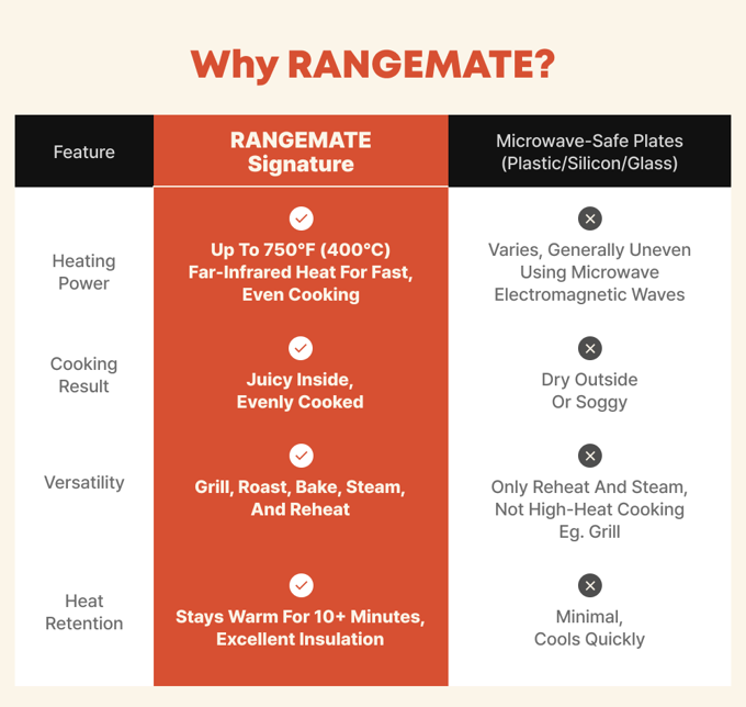렌지메이트(RANGEMATE) 시그니처는 전자레인지로도 그릴, 로스트, 베이킹 등 다양한 고열 조리가 가능하며 10분 이상 온기를 유지할 수 있습니다.