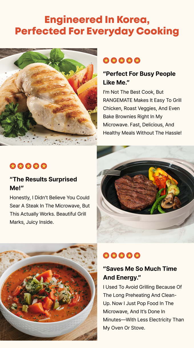 국내기업인 펠리테크(PELLYTECH)가 만든 렌지메이트(RANGEMATE) 시리즈는 바쁜 일상 속에서도 전자레인지로 그릴 자국이 선명한 스테이크나 건강한 요리를 쉽게 완성하며, 긴 예열과 복잡한 세척 과정을 생략하여 시간과 에너지를 혁신적으로 절약해주는 조리기구 입니다.