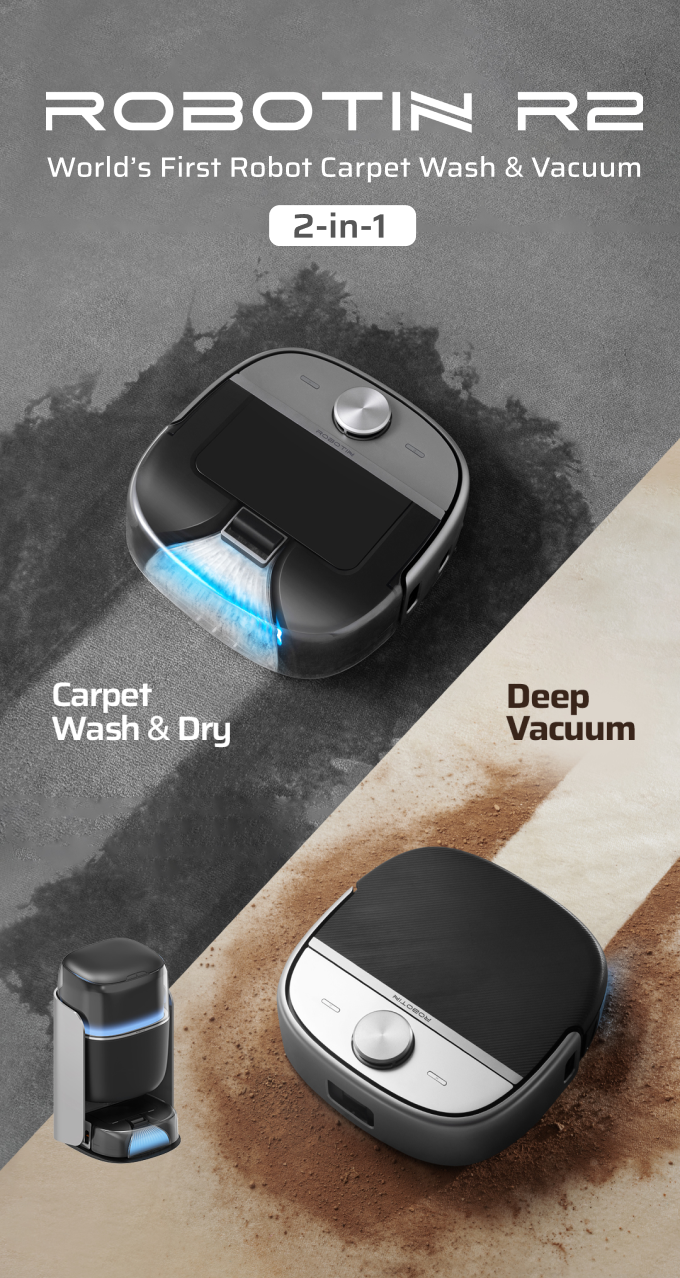 로보틴(Robotin)은 강력한 진공청소는 뿐 아니라 카펫 세탁 및 온열 건조까지 자동으로 3-in-1 청소가 가능한 R2 로봇청소기를 개발하였습니다. 115AW의 강력한 흡입력과 AI-인지 시스템을 통해 모든 바닥 재질에 최적화된 청소가 가능합니다. 특히 자동화된 베이스 스테이션은 물 보충 및 폐수 처리를 지원하여 사용자 개입을 최소화합니다.