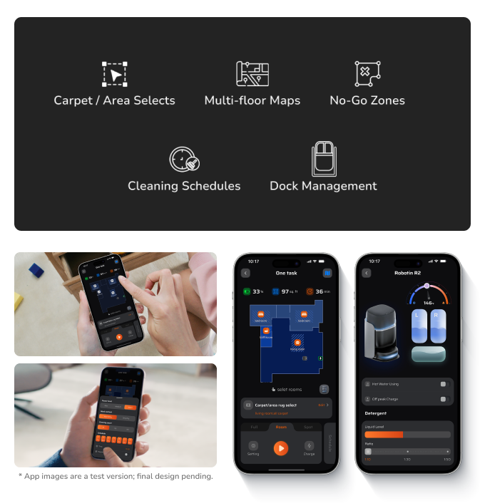 R2는 스마트 앱 제어를 통해 사용자 맞춤형 청소 환경을 제공합니다. 다층 지도 관리, 카펫/구역 선택, 청소 일정 설정 및 진입 금지 구역 설정 등의 기능을 지원하며, 손쉬운 조작으로 개인화되고 효율적으로 청소 합니다.