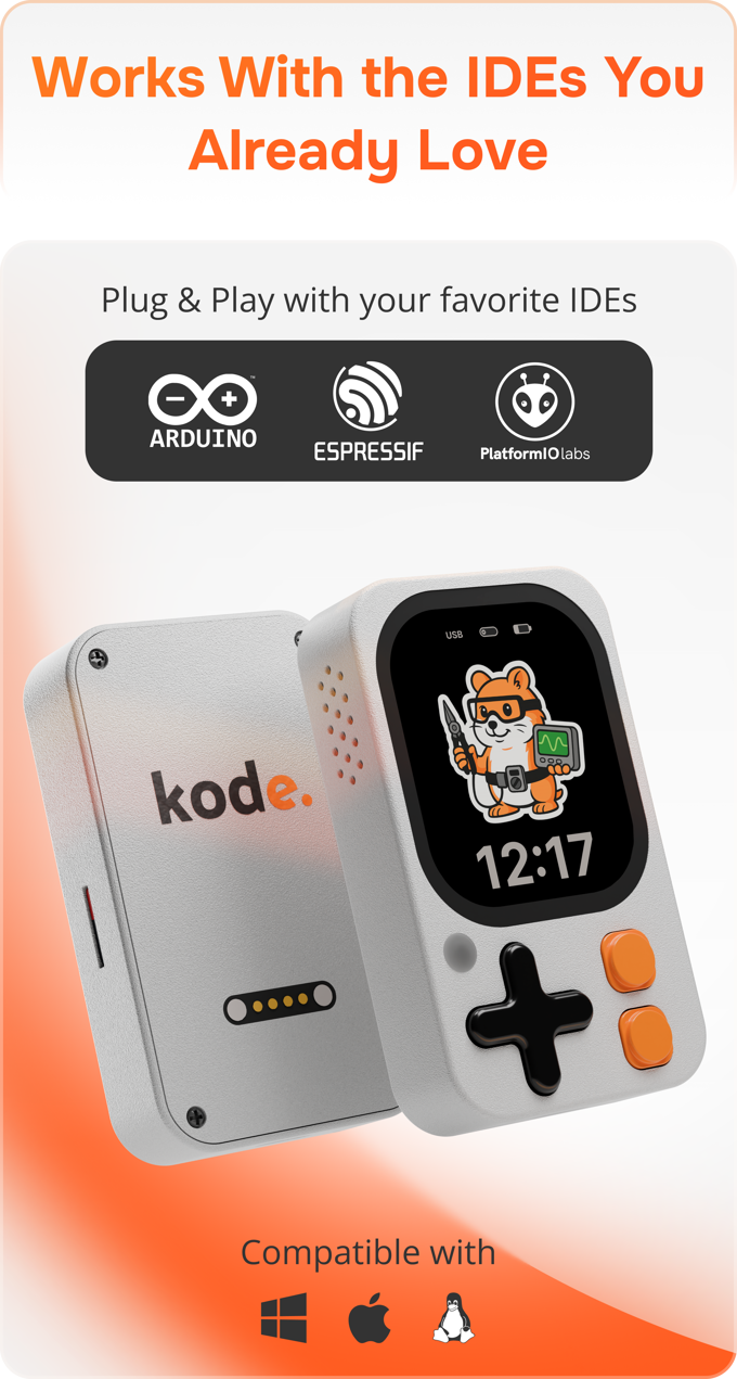 코드닷(Kode Dot)은 익숙한 개발 환경(Arduino, PlatformIO, ESP-IDF)을 그대로 지원합니다. USB-C를 통해 코드를 업로드하면 즉시 kodeOS 내에서 재사용 가능한 앱으로 변환되어, 기존 지식을 활용하면서도 신속하고 효율적인 프로젝트 관리가 가능합니다.