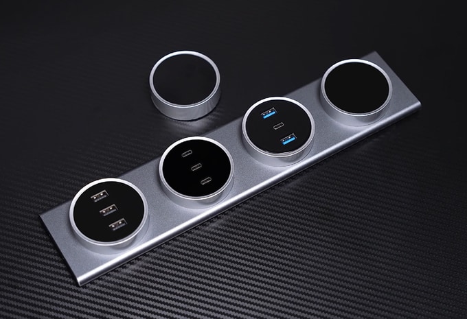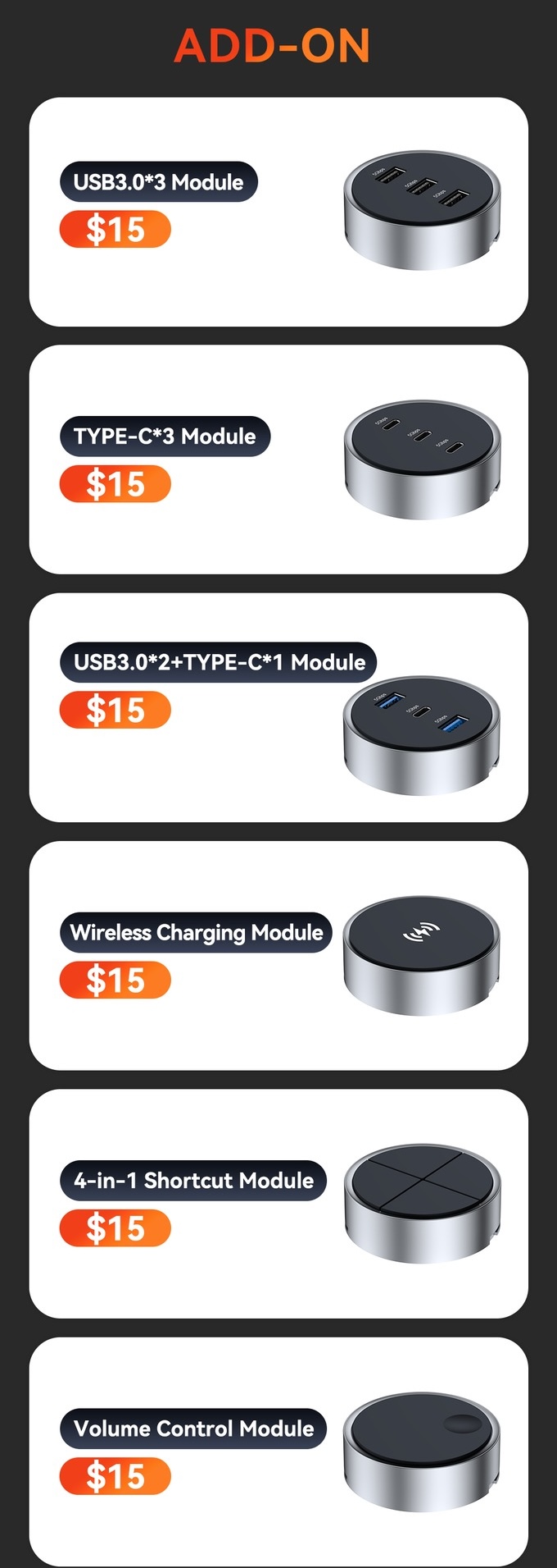 선택할 수 있는 6가지 모듈은 고속 무선 충전, 3포트 USB-C, 3포트 USB-A (3.0), USB-A 및 USB-C 혼합 포트, 원터치 볼륨 제어, 그리고 작업 흐름을 간소화하는 4-in-1 매크로 키 등 각각 고유한 기능을 제공합니다.