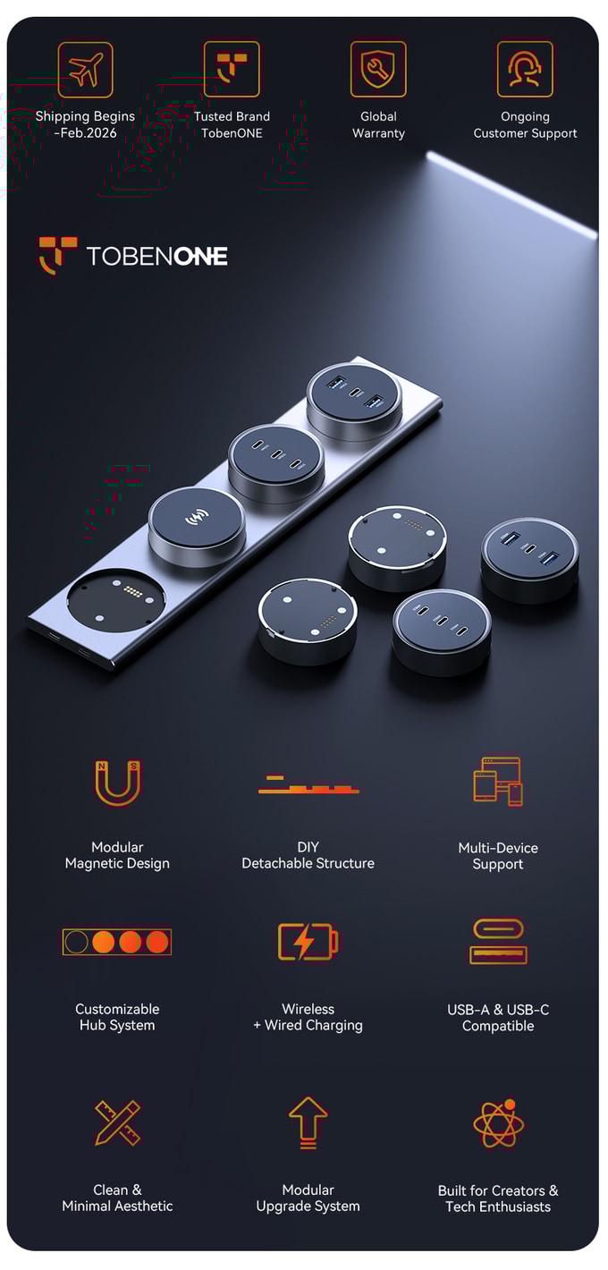 더 이상 어댑터를 번거롭게 다루거나 여분 포트를 찾을 필요가 없습니다. 토벤원(TobenONE) 모듈형 멀티 허브는 작업 공간을 깔끔하고 효율적이며 미래 지향적인 충전 생태계로 변화시킵니다. 이는 사용자의 요구에 맞춰 함께 성장하도록 설계된 스마트한 솔루션입니다.