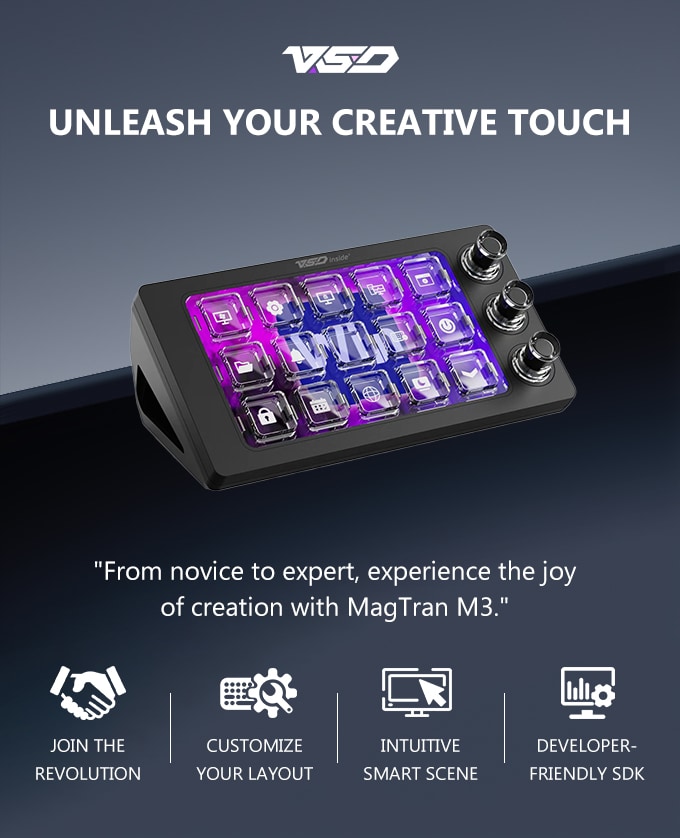 매그트랜(MagTran) M3은 투명 마그네틱 스위치를 탑재하고, 키 디스플레이와 기능을 사용자 맞춤형으로 완벽하게 구현한 투명 보조 키보드입니다. 게이밍, 스트리밍, 작업 효율화를 넘어 스마트 홈 제어까지 아우르는 다양한 활용성과 접근성을 높이기 위해 오픈 SDK와 클라우드 플랫폼을 통해 사용자 및 개발자가 함께 창작물과 리소스를 공유할 수 있도록 하였습니다.