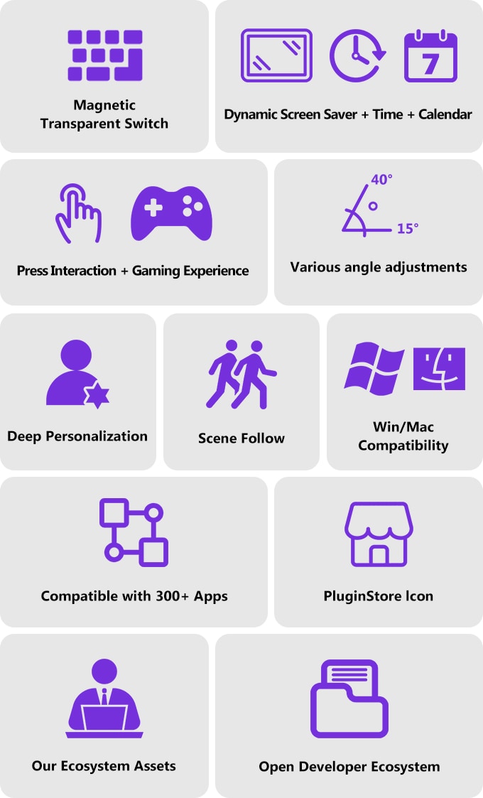 M3는 마그네틱 투명 스위치와 300개 이상 앱 호환성을 갖춘 보조 키보드입니다. 동적 화면 보호기, 깊은 개인화, 각도 조절, Win/Mac 호환 및 개방형 개발자 생태계를 통해 사용자 맞춤형 디지털 상호작용의 표준을 제시합니다