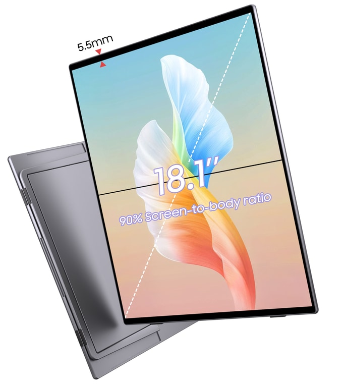 13.3인치 두개의 OLED 패널을 적용하여 펼쳤을 때 18.1인치 대화면에 90%의 넓은 화면 비율로 뛰어난 몰입감을 선사합니다. 또한, 얇은 5.5mm의 베젤 디자인으로 시각적 경계를 최소화하여 세련되고 확장된 시청 경험을 제공합니다.