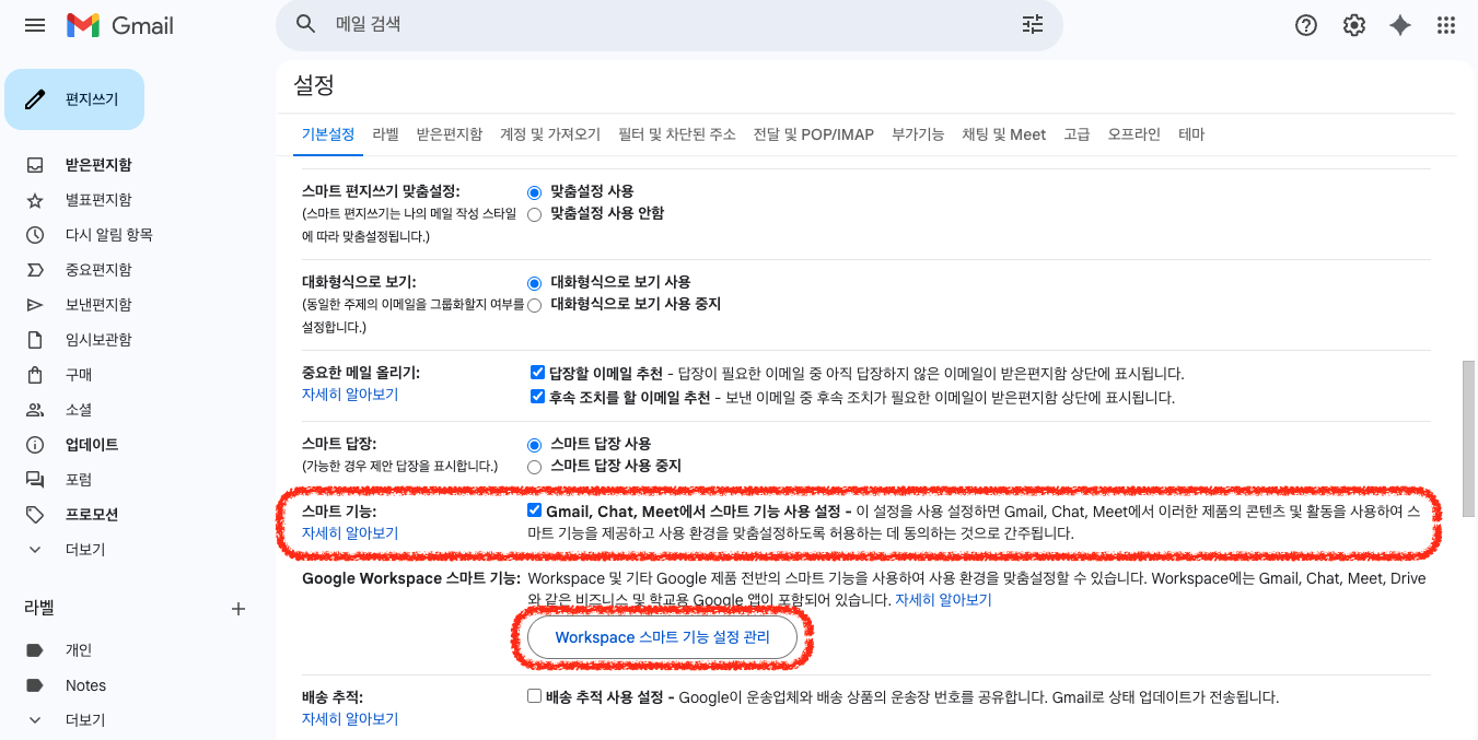 Gmail의 설정에서 '스마트 기능'은 맞춤법 검사 외에도 주문 추적, 이메일 내 항공편 정보를 캘린더에 자동 추가하는 등 사용자의 편의를 돕는 다양한 기능을 포함하고 있습니다.