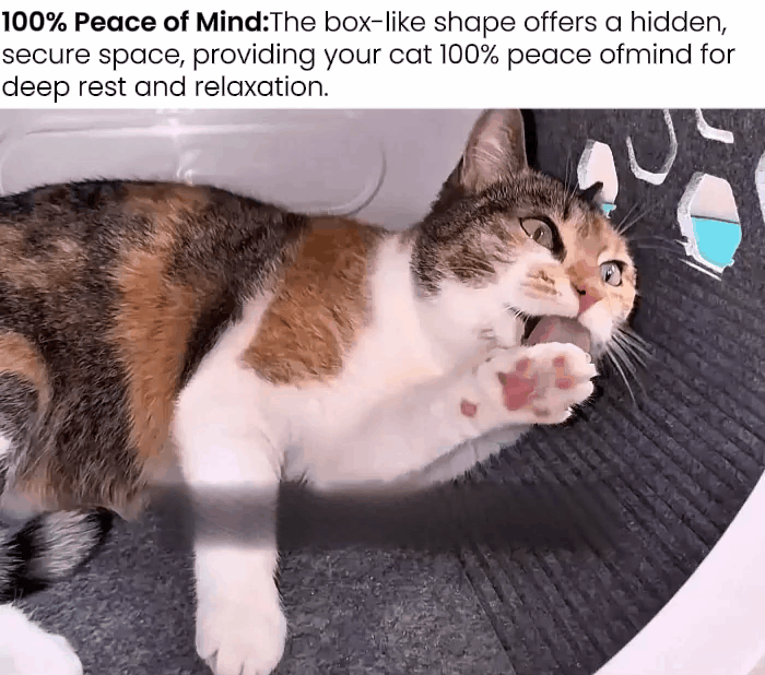 파우스윙 네오(PawSwing Neo)의 상자형 디자인은 고양이에게 숨겨진 안전하고 안락한 공간을 제공합니다. 이는 고양이의 100% 심리적 안정감(Peace of Mind)을 보장하여, 깊은 휴식과 이완을 취할 수 있는 최적의 환경을 조성합니다.