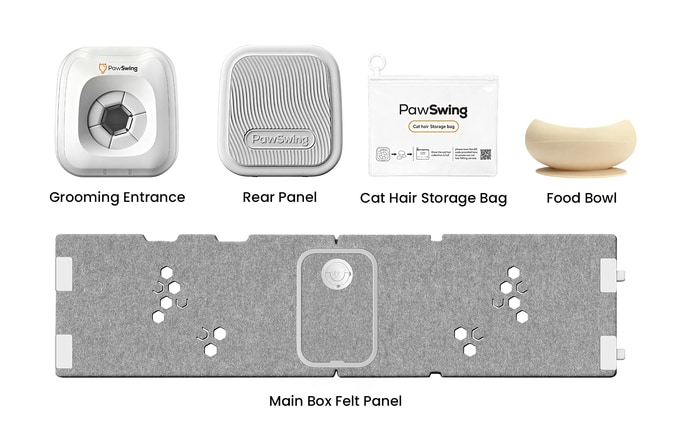 파우스윙 네오(PawSwing Neo)는 고양이의 식사 본능과 그루밍을 연계하는 '보상 순환 시스템'을 통해 고양이가 스스로 털을 관리하게 하는 솔루션 입니다. 고양이 혀의 갈고리 모양 구조를 모방한 그루밍을 통해 털이 바닥에 떨어지기 전에 제거합니다. 대부분의 고양이가 스트레스 없이 활용할 수 있으며, 대형 고양이도 입구를 조절하여 털을 관리할 수 있도록 만든 장치입니다.